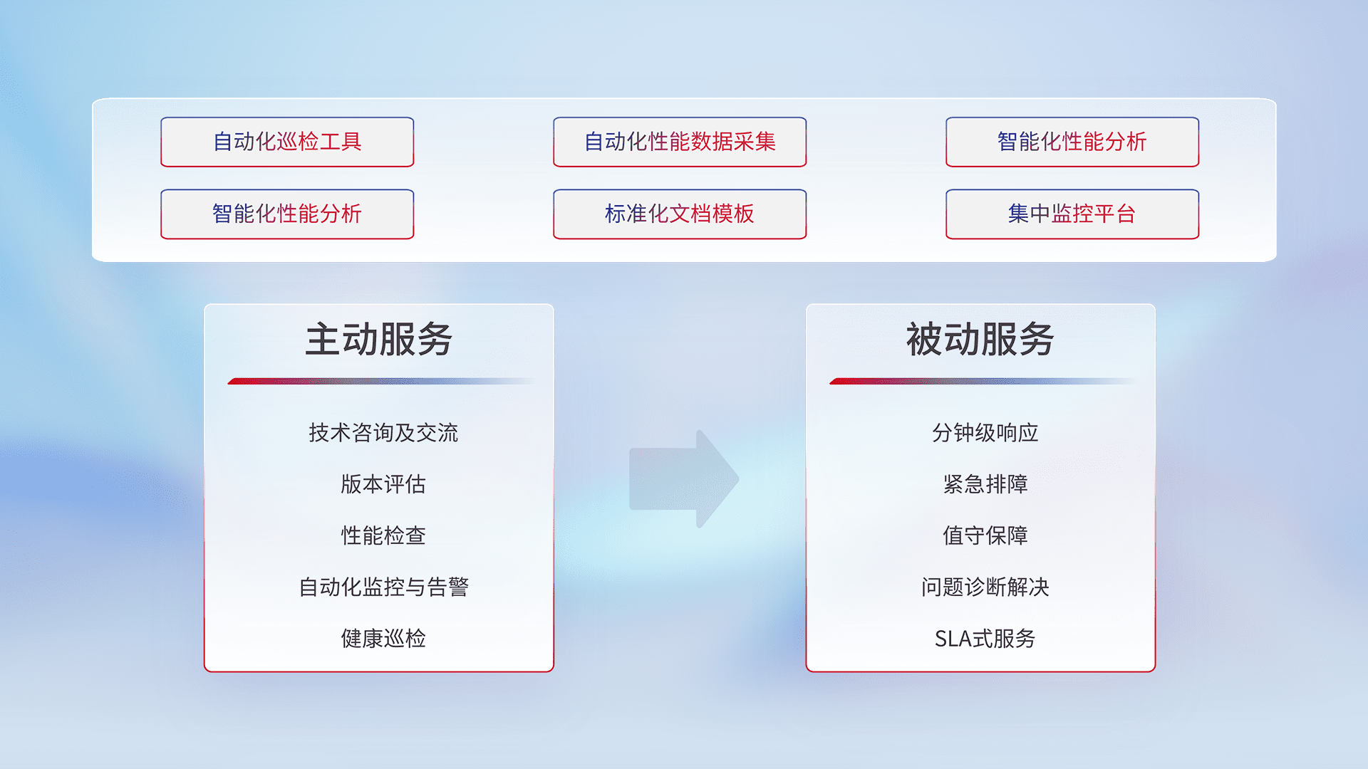 智能化工具和标准化文档,,,,保障服务质量,,提供主动服务(包含技术咨询、、版本评估、、、性能检查、、、、自动化监控与告警、、、健康巡检)和被动服务包含(分钟级响应、、、、紧急排障、、、、值守保障、、问题诊断解决、、、SLA服务)。。。。